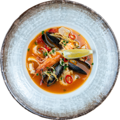 consomme rybne z pomidorami san marzano, krewetki tygrysie, kalmary baby, mule, czosnek chilli, seler naciowy, podawana z focaccią