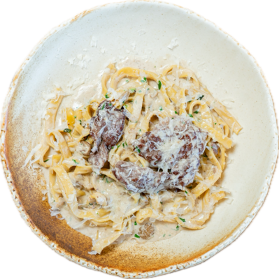 makaron tagliatelle, borowik, polędwica wołowa, śmietanka, czosnek, parmezan D.O.P.