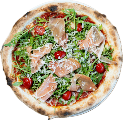 sos pomidorowy, mozzarella fior di latte, szynka parmeńska, rukola, pomidorki koktajlowe, pecorino romano dop