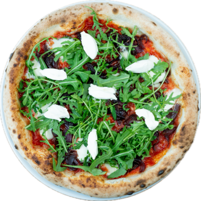 sos pomidorowy, mozzarella fior di latte, pecorino romano dop, salami spianata piccante, czerwona karmelizowana cebula, rukola, mascarpone