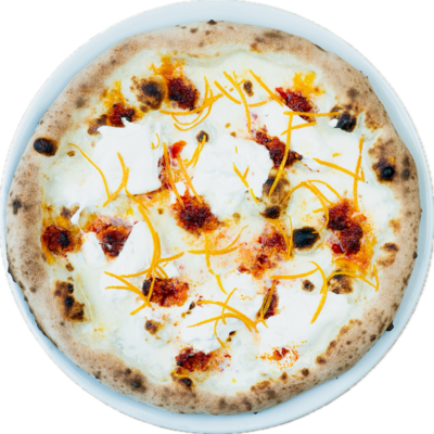 sos śmietanowy, pecorino romano dop, mozzarella fior di latte, nduja, mascarpone, zest z pomarańczy