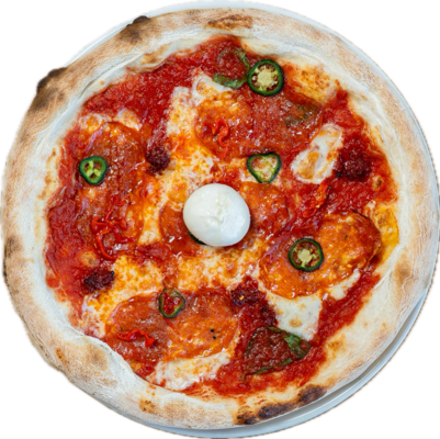 sos z pomidorów san marzano, pecorino romano dop, mozzarella fior di latte, salami spianata piccante, nduja, habanero, jalapeño, ser burrata, miód